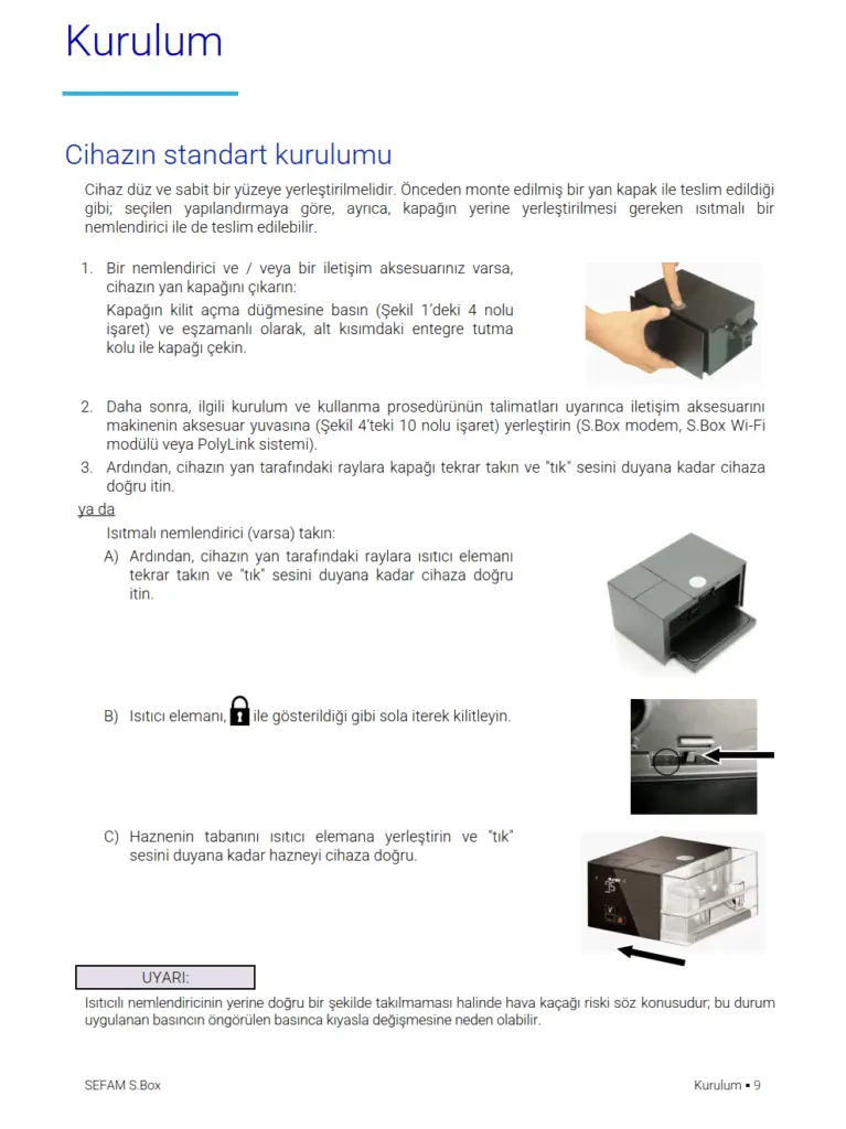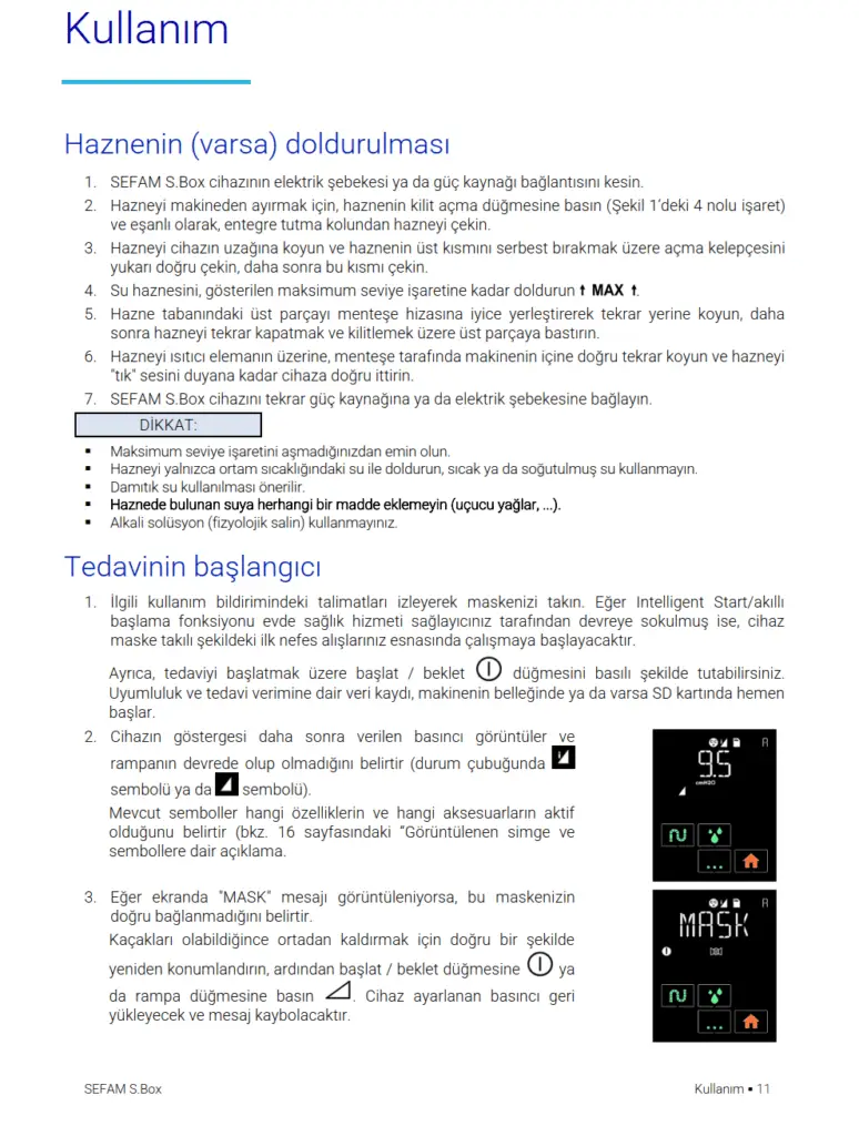 SEFAM S.Box cihazı, kendiliğinden nefes alan, 30 kg üstü hastalarda Obstrüktif Uyku Apne ve Hipopne Sendromu (OSAS) tedavisinde endikedir. Evde veya bir sağlık bakım merkezinde (hastane veya klinikte) kullanılmak üzere tasarlanmıştır. Bir yerden bir yere kolayca taşınabilmek üzere tasarlanmıştır ve uçak içinde kullanılabilir. Isıtıcılı nemlendirici S.Box, Obstrüktif Uyku Apne ve Hipopne Sendromu (OSAS) tedavilerinde, SEFAM S.Box cihazı tarafından hastaya verilen havanın nem oranını arttırmak ve ısıtmak için tasarlanmış bir aksesuardır. Yetişkin hastalarda evde veya hastanede kullanılmak üzere tasarlanmıştır.